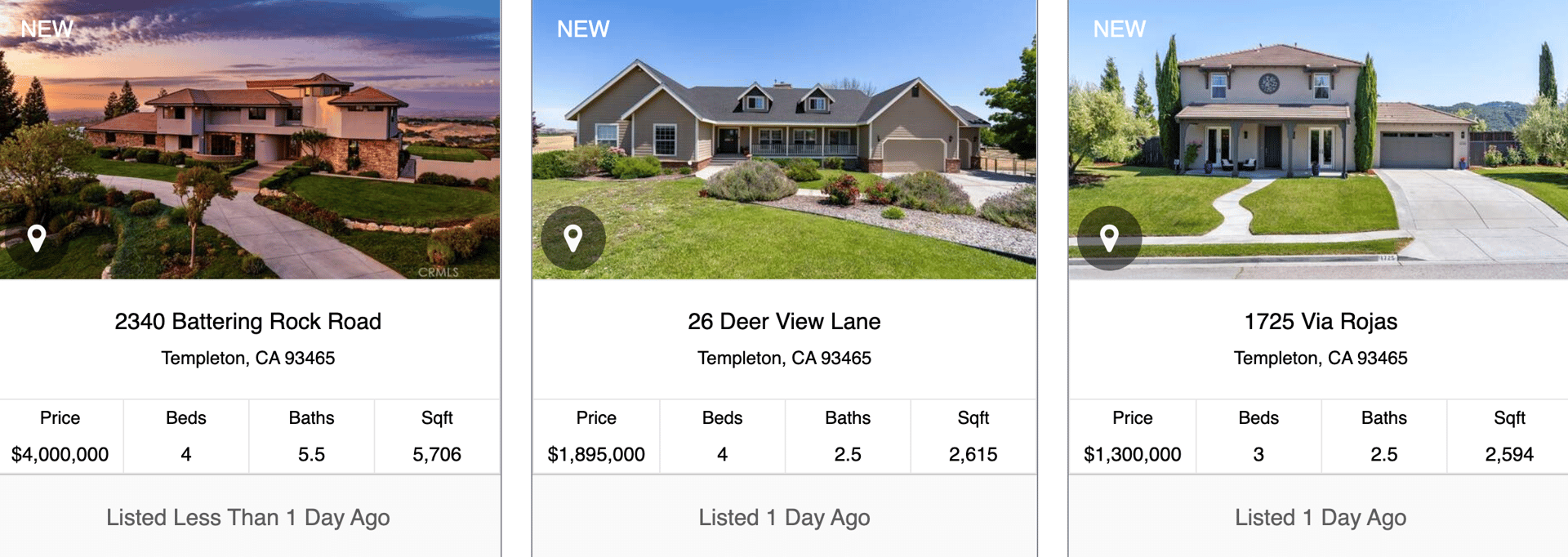 Explore stunning new homes in Templeton, CA, featuring luxurious listings like the expansive 4-bed, 5.5-bath estate on Battering Rock Road, a charming 4-bed home on Deer View Lane, and a cozy 3-bed residence on Via Rojas, all offering modern amenities and beautiful surroundings.