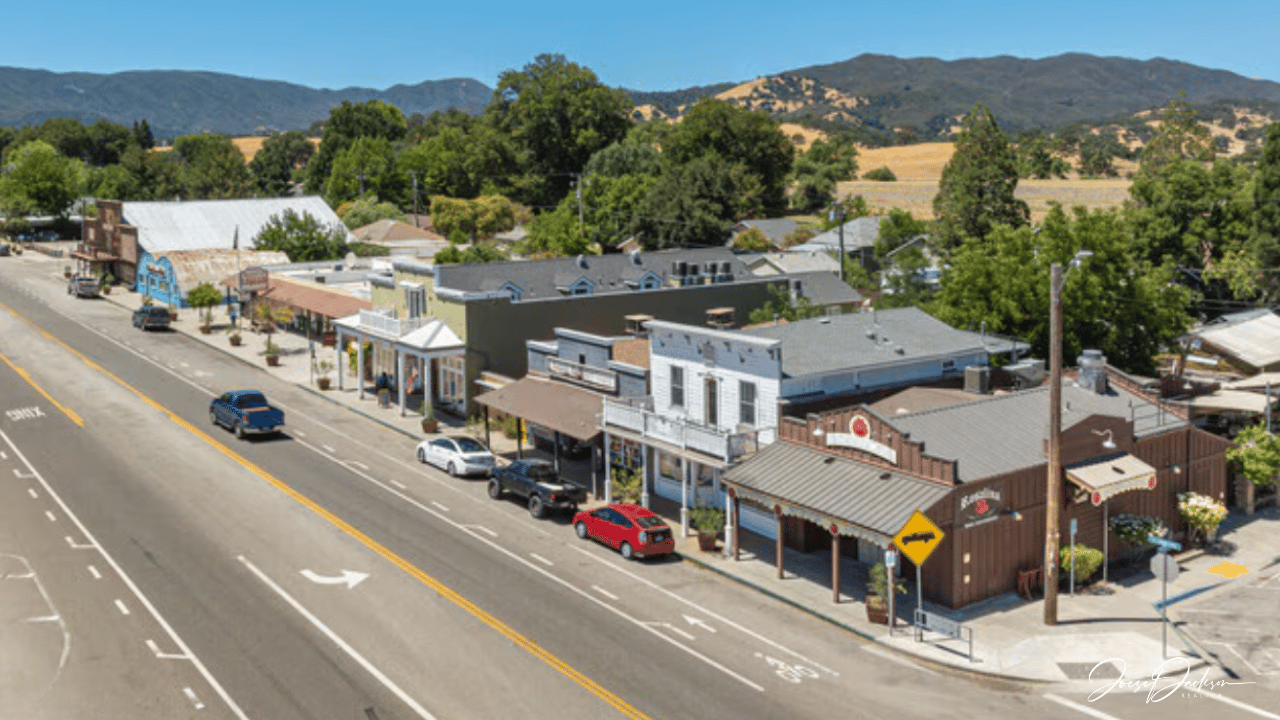 Charming downtown Templeton features quaint storefronts and a picturesque street, nestled against a backdrop of rolling hills and lush greenery.